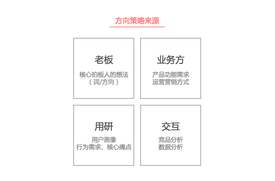 得出这个重要结论,需要向各方收集信息,包括老板、产品/运营、用户、设计等;通过对信息的去伪存真,归纳总结得到本次设计的原因、目标、方向、策略。每个点的提出都必须是有原因的,可基于策略、数据、反馈等。